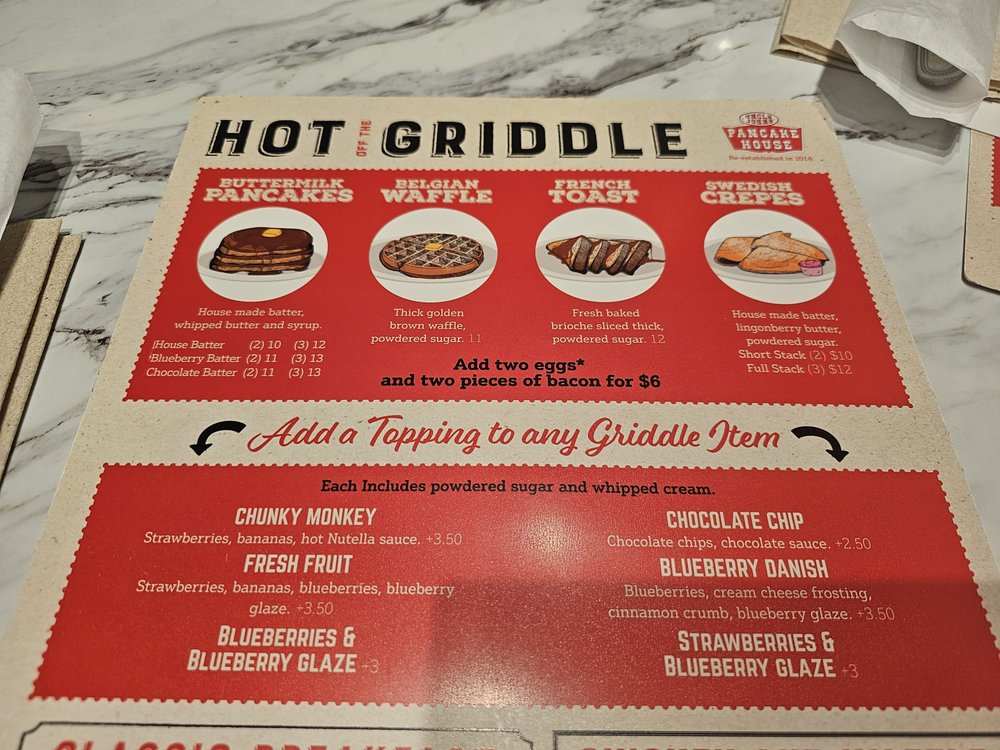 Two eggs any style, house-made country gravy, hash browns, pancakes or toast.