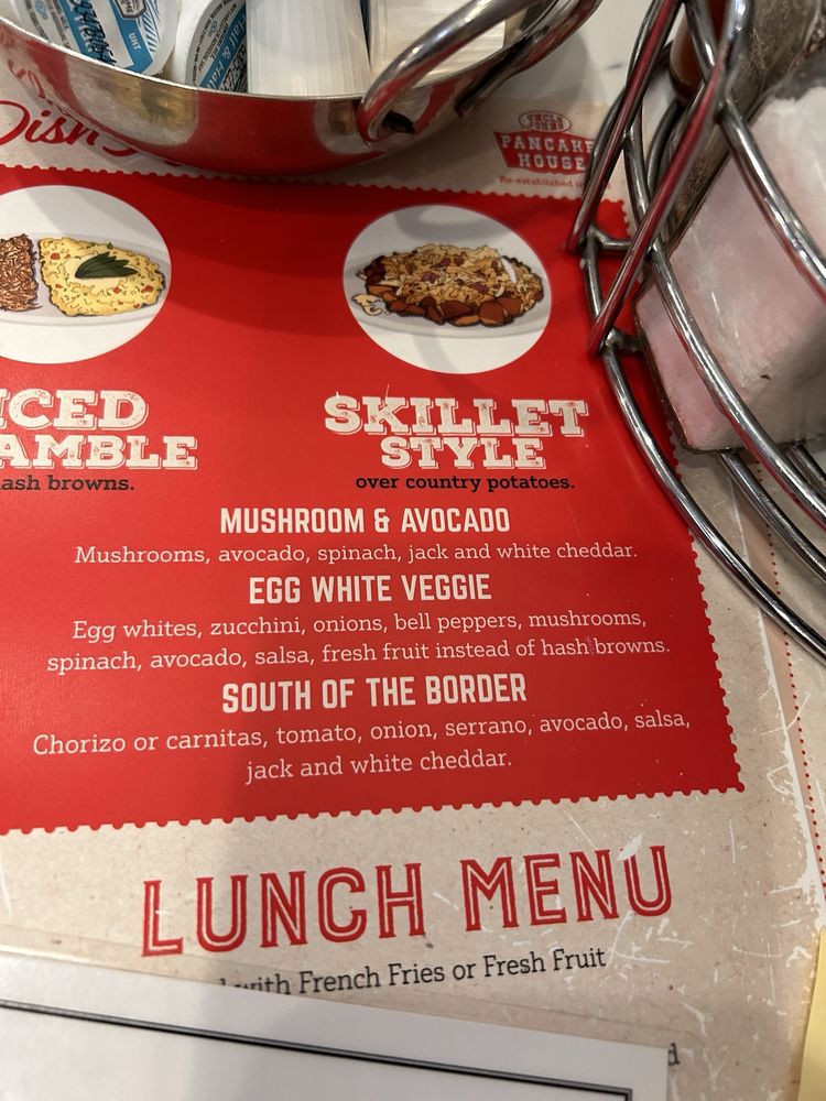 Egg whites, zucchini, onions, bell peppers, mushrooms, spinach, avocado, salsa, fresh fruit instead of hash browns.