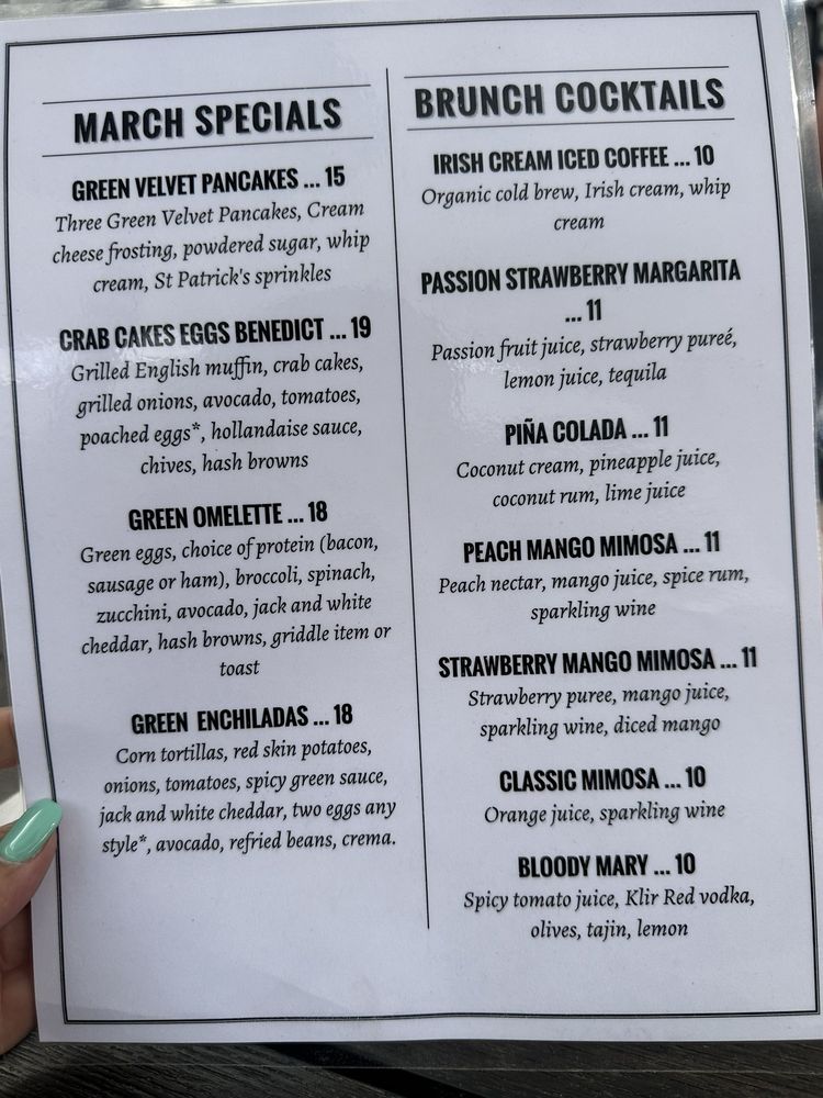 From scratch! Tender corned beef brisket, diced potatoes, bell peppers, onions, two eggs any style, hash browns, pancakes or toast.